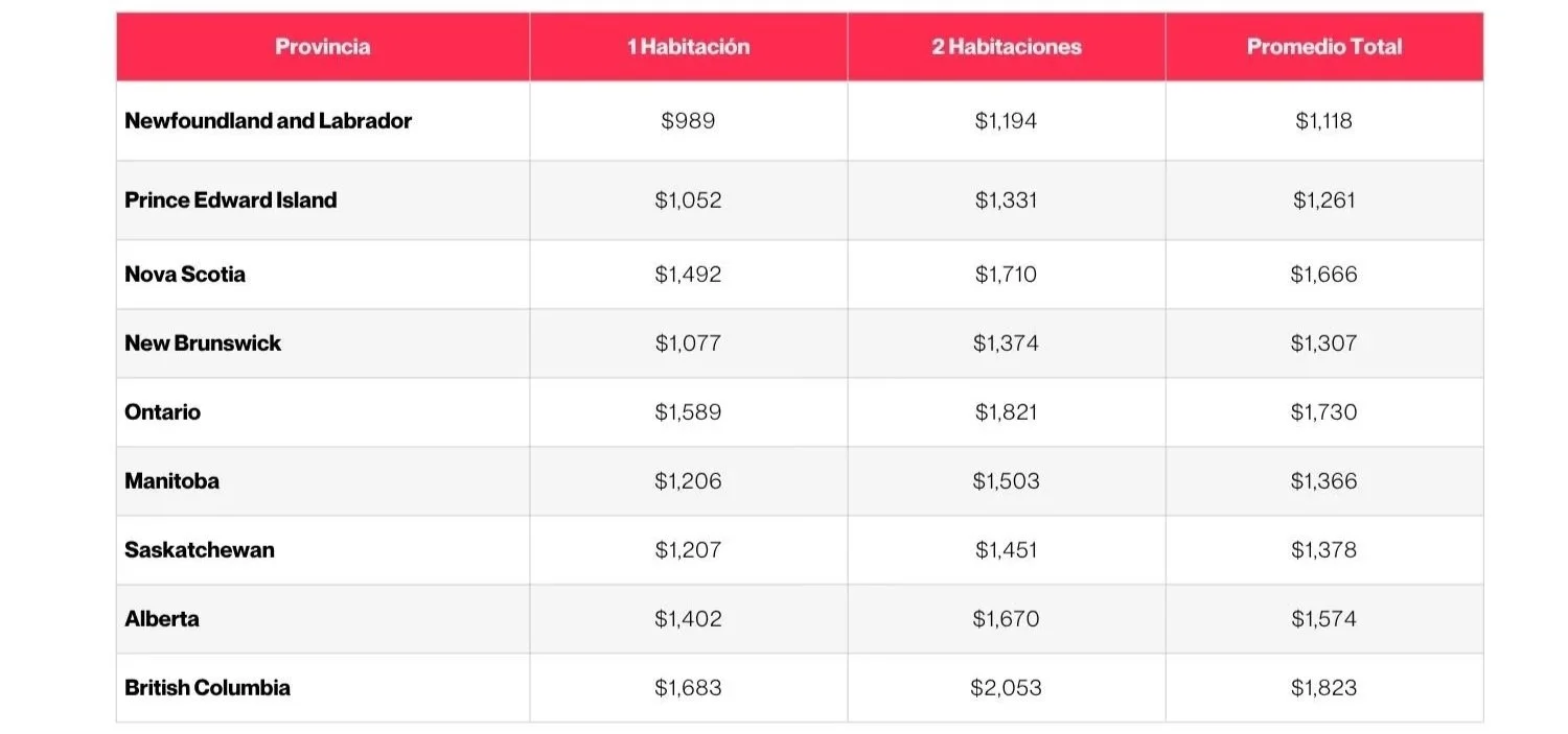 British Columbia y Ontario siguen siendo las provincias más caras para rentar en promedio, mientras que Manitoba, Saskatchewan, New Brunswick y varias provincias del Atlántico siguen siendo más accesibles. Las tasas de vacancia provinciales de CMHC 2025 muestran: 4.2% en Alberta, 3.3% en Saskatchewan, 3.2% en Ontario, 2.9% en Manitoba y New Brunswick, 2.6% en Nova Scotia, 2.1% en Newfoundland and Labrador y 2.0% en Prince Edward Island.