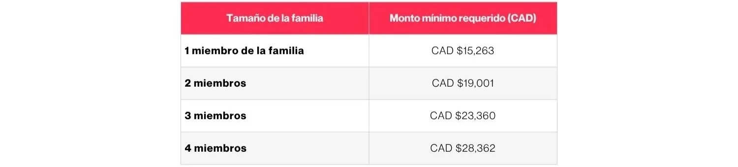 IRCC explica que la prueba de fondos es obligatoria para programas como el Federal Skilled Worker Program y el Federal Skilled Trades Program. La tabla oficial actualizada al 7 de julio de 2025 establece los siguientes montos mínimos de fondos de establecimiento: