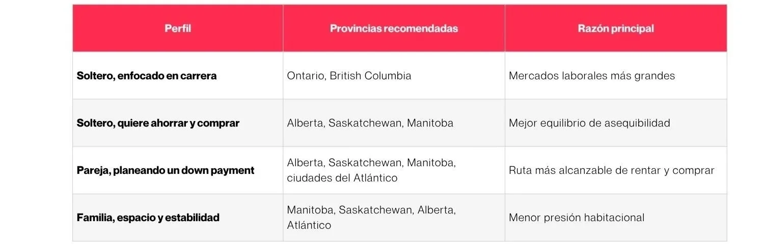 Una mejor pregunta que '¿qué provincia es más barata?' es: ¿qué provincia tiene más sentido para mis metas y mi estructura familiar? En términos generales, Ontario y British Columbia siguen siendo fuertes por el acceso a mercados laborales más grandes, mientras que Alberta, Saskatchewan, Manitoba y destinos seleccionados del Atlántico tienden a ofrecer un equilibrio más útil para quienes también están pensando en asequibilidad y vida familiar.