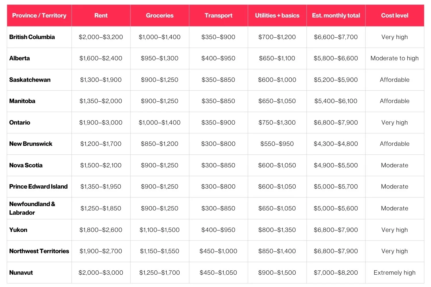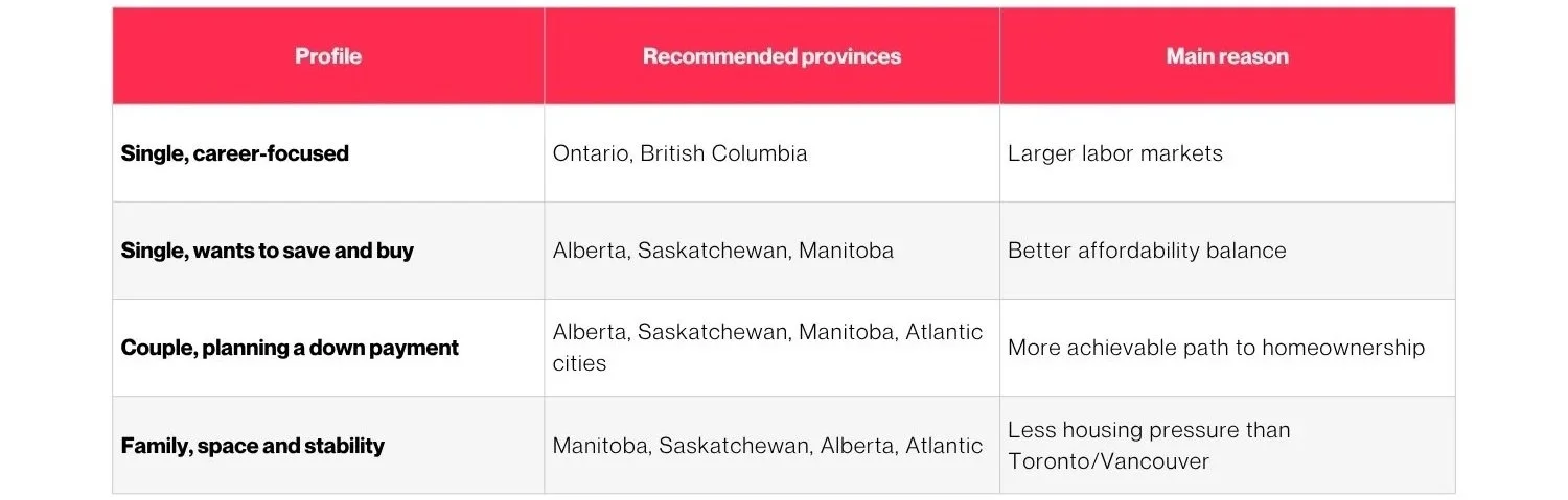 If you arrive alone: Alberta also has a daily budget advantage because it has no provincial sales tax. If you arrive as a couple: Alberta, Saskatchewan, Manitoba, and selected Atlantic cities tend to make more practical sense. If you arrive with a family: Manitoba, Saskatchewan, and Alberta stand out more for those who eventually want to buy a home.