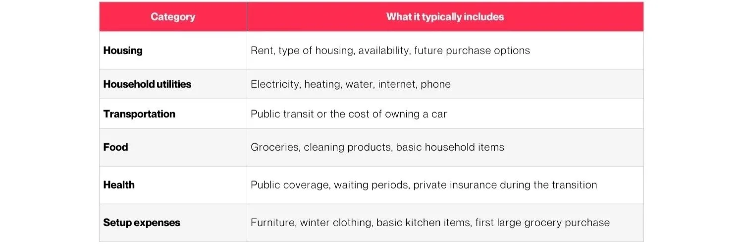 This matters because the first months in Canada are rarely just a normal monthly budget. They often include both monthly living expenses and one-time setup costs at the same time.