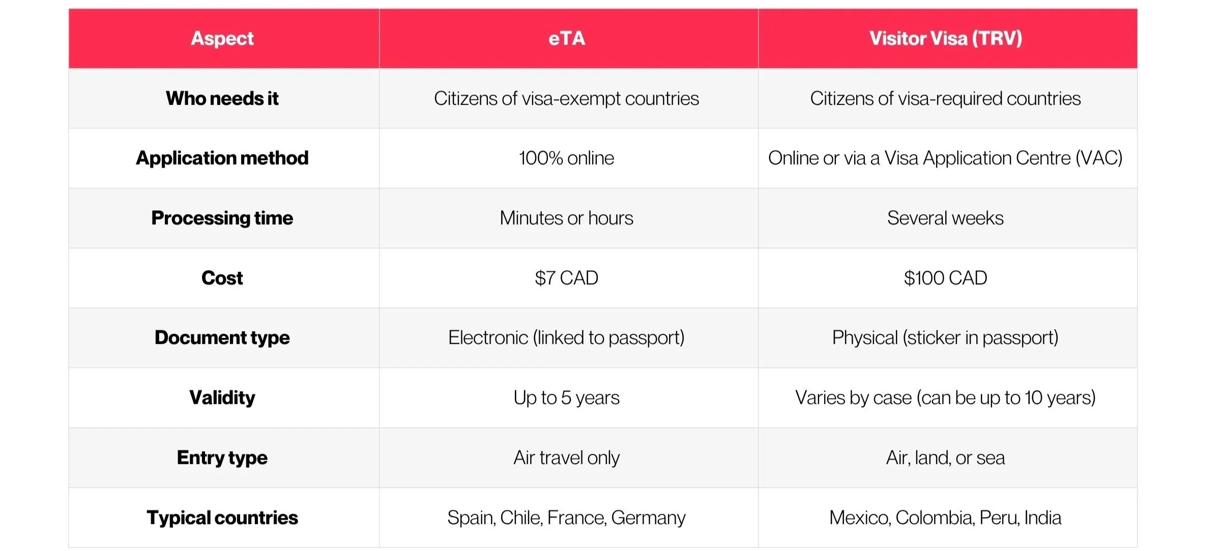 The eTA applies only to air travel. If you enter through the U.S. border or on a cruise, you’ll need a Visitor Visa instead.