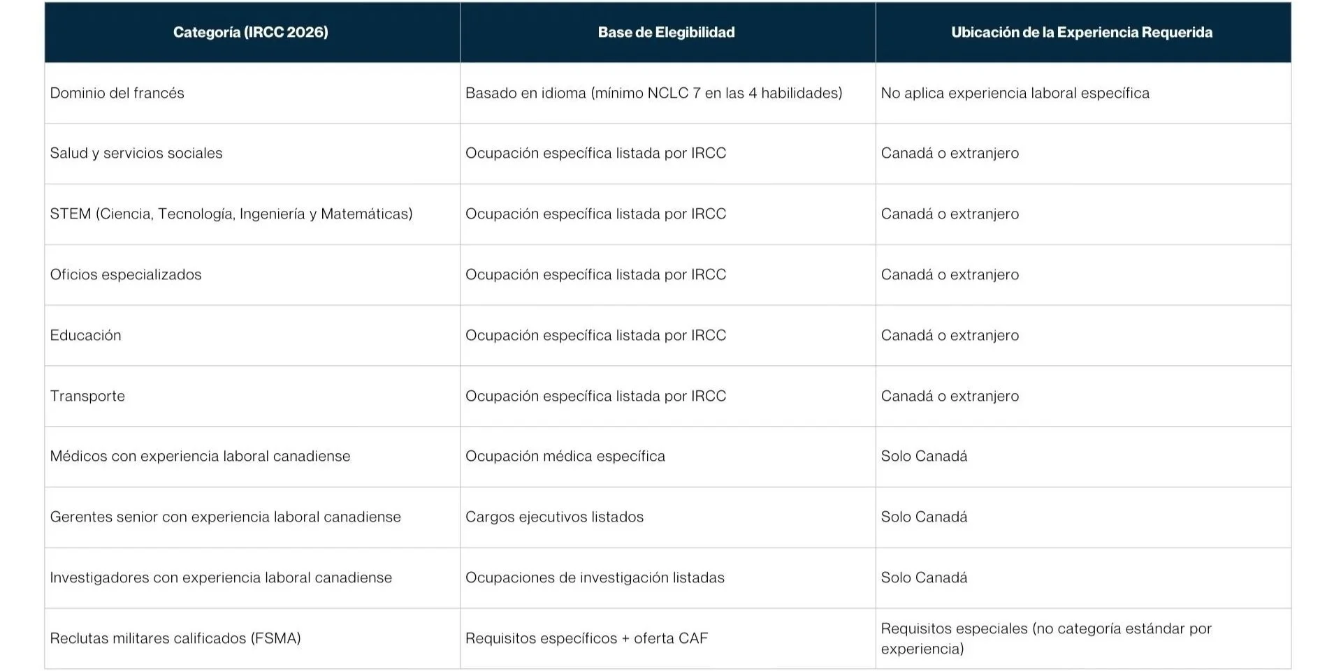Esta guía explica la selección por categorías utilizando exclusivamente criterios oficiales de IRCC y distingue claramente entre las categorías que requieren experiencia laboral canadiense y aquellas que permiten experiencia obtenida en Canadá o en el extranjero.