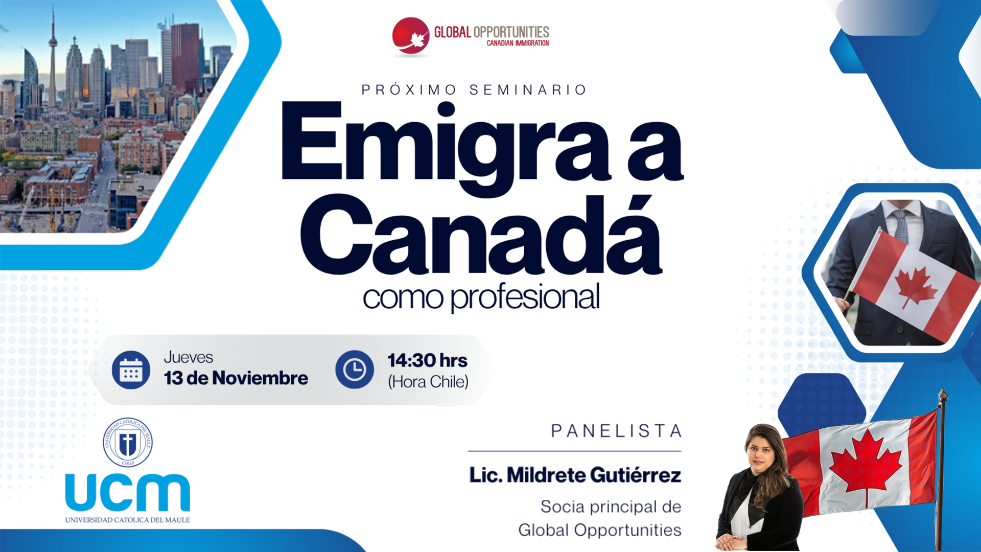 Gracias por tu interés en asistir a nuestro seminario con la Universidad Católica del Maule sobre cómo emigrar a Canadá y obtener tu residencia permanente, te invitamos a llenar el formulario para enviarte la información de inscripción.