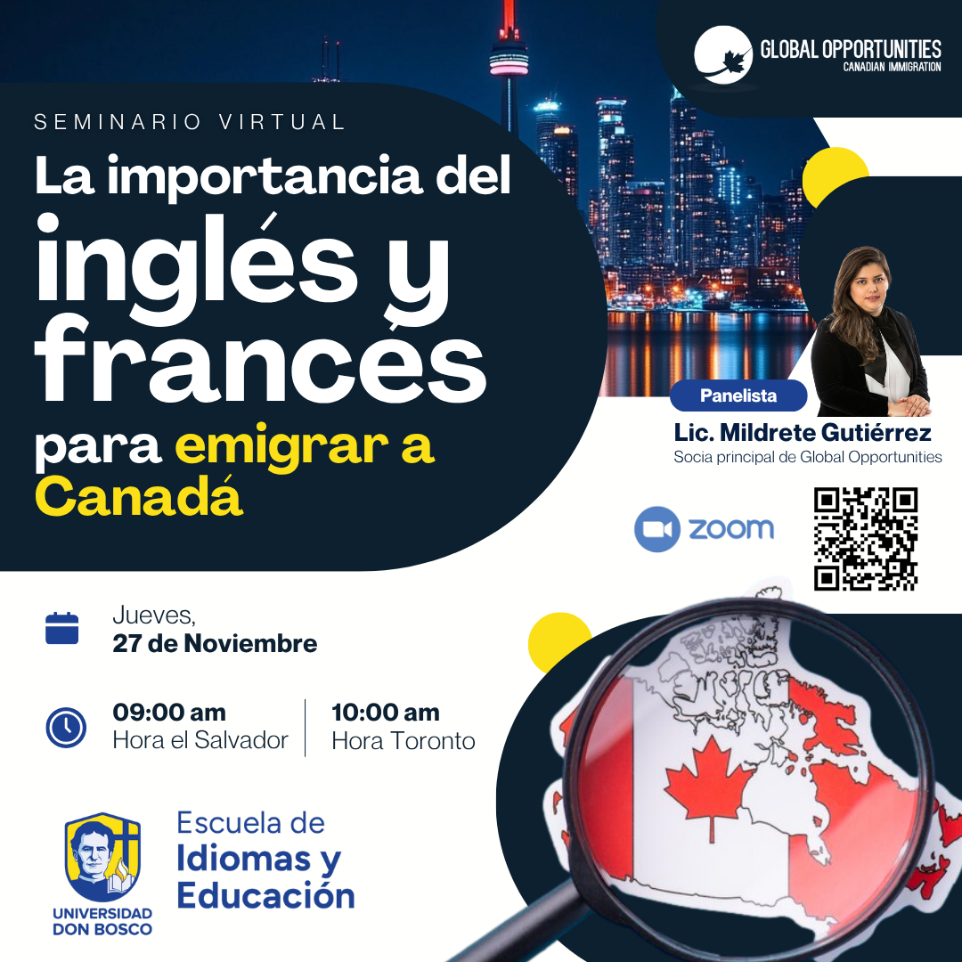 Gracias por tu interés en asistir a nuestro seminario virtual con la Universidad Don Bosco de El Salvador -Centro de idiomas- sobre la importancia del inglés y francés para obtener tu residencia permanente, te invitamos a llenar el formulario para enviarte la información de inscripción.