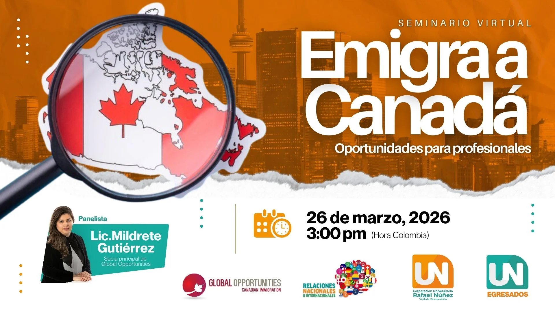 Gracias por tu interés en asistir a nuestro seminario con la Corporación Universitaria Rafael Núñez- UNINÚÑEZ, sobre las opciones migratorias en Canada para Profesionales, te invitamos a llenar el formulario para enviarte la información de inscripción.